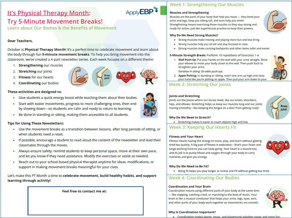 October is PT Month! Free 4-Week Classroom Movement Break Newsletter
